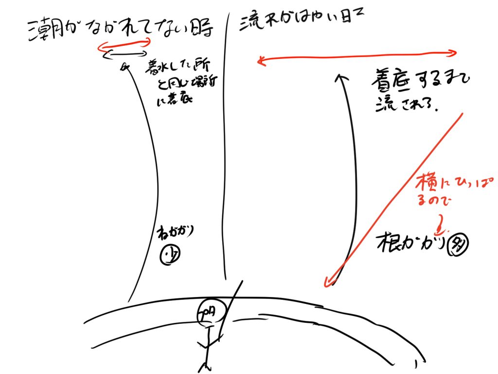 いい考えだと思ったのですが、当日持っていたブラクリは5号。。。これくらいで行けるだろうと思っていて最初は調子よかったのですがすが。。。潮が動き始めると5号は軽すぎて投げた後、着底するまで流されました。巻くときにまっすぐに対して斜め横に引っ張ることになるので根がかりがめちゃ多い。。。