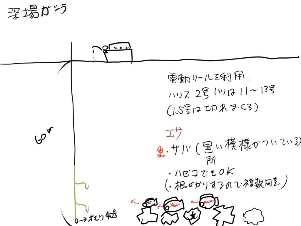 深場のガシラは水深40~60m前後あるので、電動のほうが楽ですが、手巻のリールでも問題なく楽しめそうです。海流が早いので底に落とすには50号の錘を持っていてもいいかもしれません。
