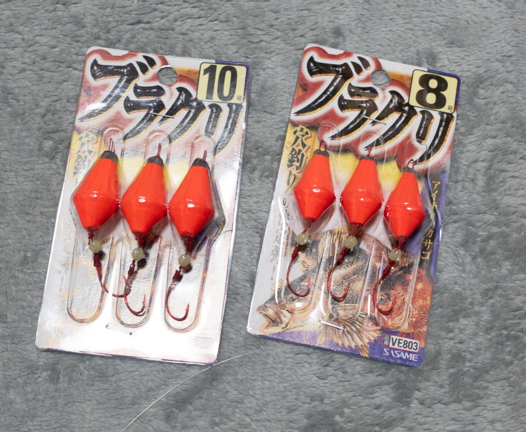 ↑ブラクリ。錘の下にすぐ針があるタイプで、ハリスでながすことがないので引っ掛かりにくい特徴があります。