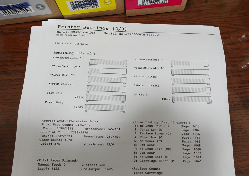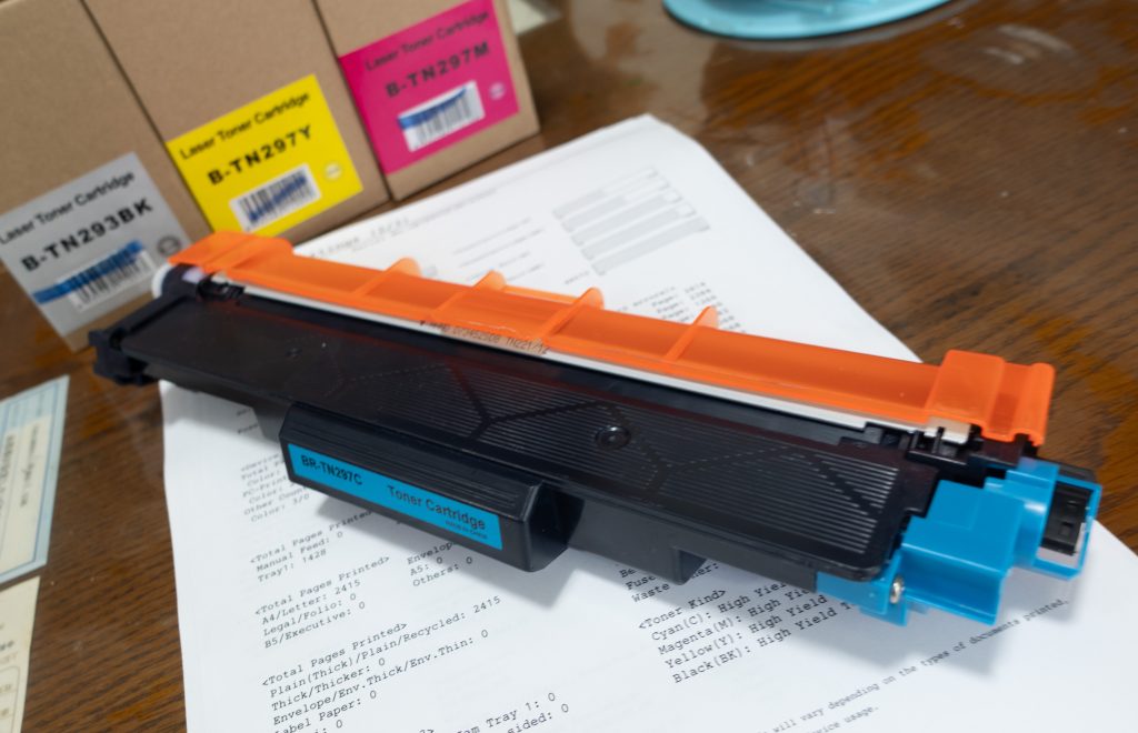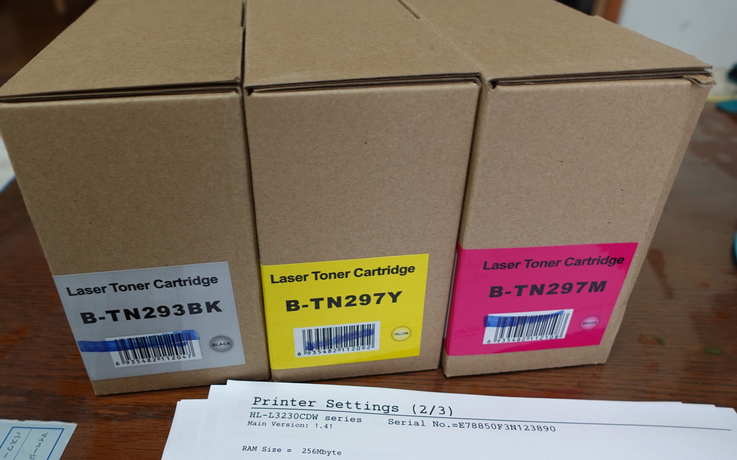 シアン(C)が全くなくなってしまっていました。このプリターはブラザーのHL-L3230CDWで純正トナーが1本、7500円くらい。4色買うと3万円。。。高い。。。