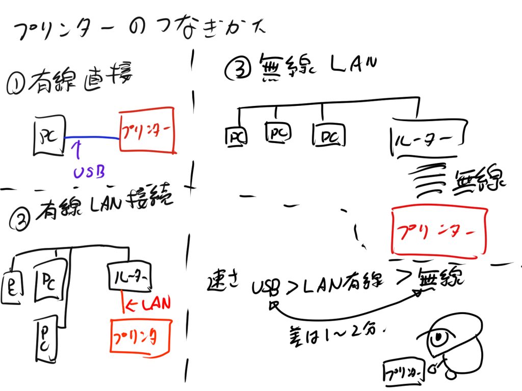 ①の接続方法はかなりシンプルで印刷データの送信もはやくていいのですが、ほかのパソコンから印刷したいときには、つながっているPC側のプリターの共有設定と常時起動が要求されるので不便。一人暮らしで1台のパソコン以外からプリントしないのであればほかの方法とくらべて安価ですごく高速です。