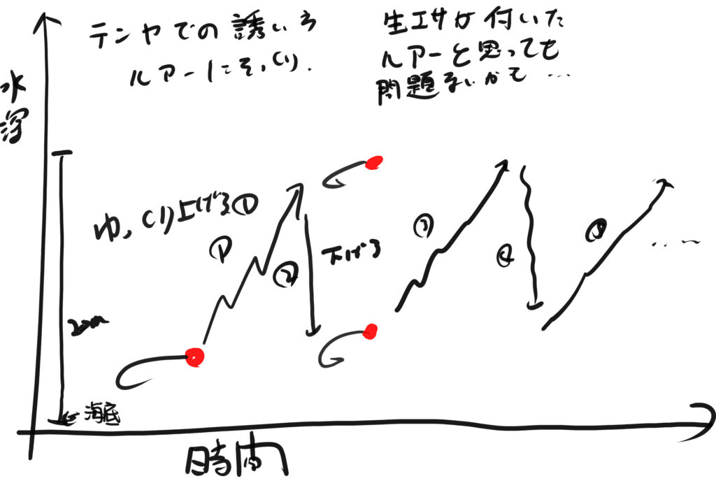 テンヤでの誘い方はゆっくり巻きながら竿を少し上下に振って水中でギザギザに動くようにします。10mくらいまで上げるともう一度海底にしずめて同じことの繰り返い詩です。