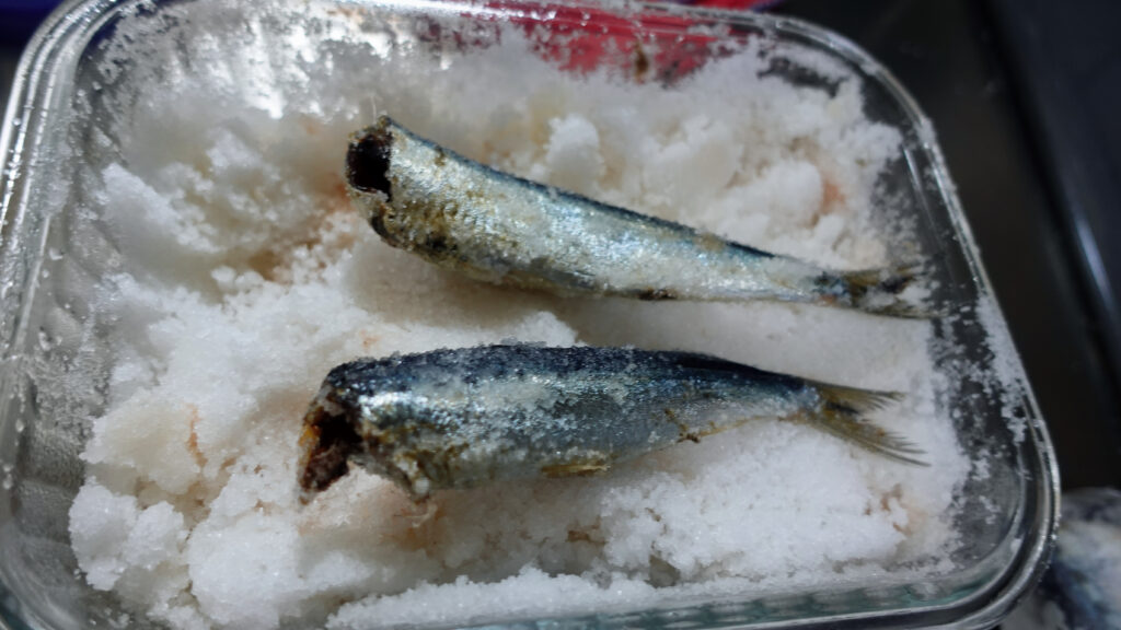 イワシの餌持ちをよくさせるためには、ずばり塩漬けを1週間やります。水分が飛んで固くなるので餌持ちがよくなります。