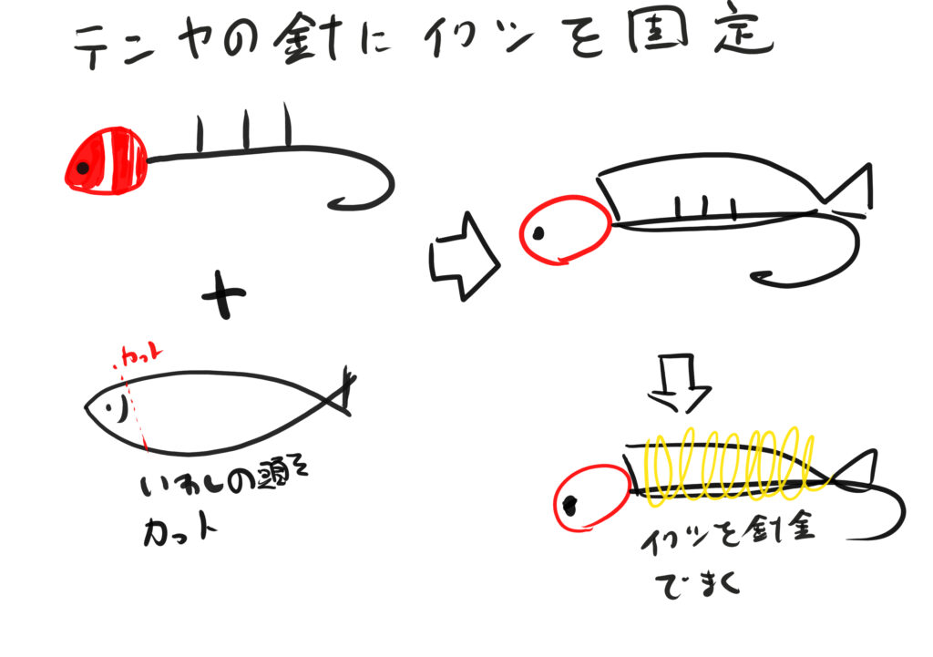 赤と白のしま模様が錘になっています。船宿によって40号、50号などの指定があるときは指定の重さを使います。錘のすぐ後ろにイワシを固定するための針が上方向に3本でています。ここにイワシを指して針金を巻きます。イメージ的には↓のかんじです