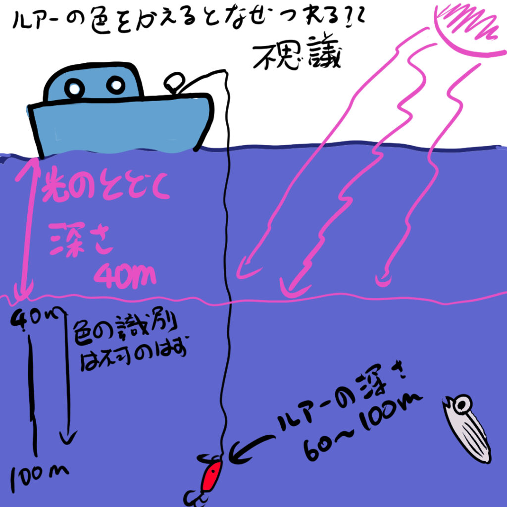 太刀魚は時間経過ととに食いつく色が変わってきて最初はオレンジ・金、そのあと紫・蛍光に変えると釣れにくい状態から釣れる状態に変化しました。ところが水深が60m付近までルアーをおとしているので光が届かない。色を識別できるはずがない領域(深さ)のはずなのにそれが不思議に思えました。
