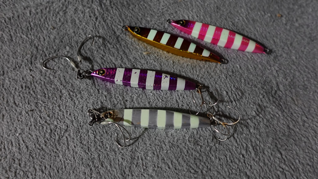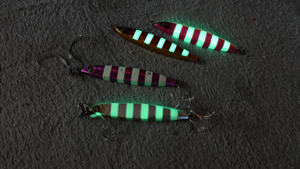 真ん中の紫・蛍光のルアーは太刀魚にかまれて少し剥げていますが、この4つのルアーは重さも形も同じ。。。。深いところでは光が届かないので色の違いはないはず???なんて思っていましたが、、、、ひょっとして蛍光が違う???そう思ってLEDで少してらした後、部屋を暗くしてみると。。。。