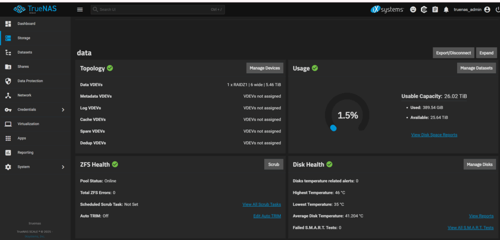 OSはTrueNasをいれて設定しています。コントロールの画面はこんな感じ