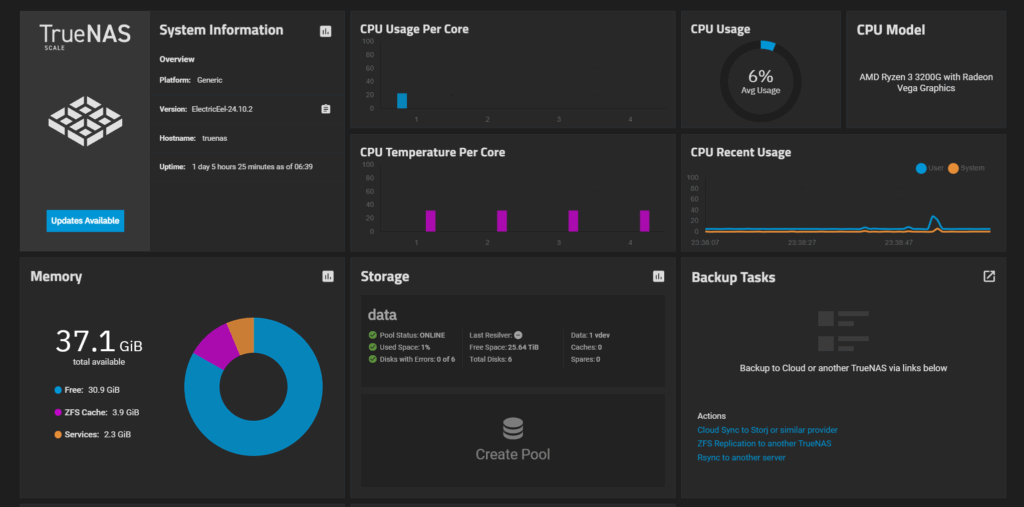 True_NasはLINUXベースのサーバー(OS)なのでサーバー自体のパワーはそれほどいらず5年くらい前のCPUでも使用率は10%いかない程度です。RAMはクロックの違いは差がほとんど感じられませんが、多く積むとより快適(転送がスムース)になります。ダッシュボードはこんな感じです