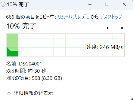 実際、40Gbpsに対応したデバイスを持っていません。。。。爆笑。。。でしかたがないので早いSSDカードリーダーで10GBほどPCにデータを転送してしみました。(SDカードも早いタイプのものを使用)その結果は。。。