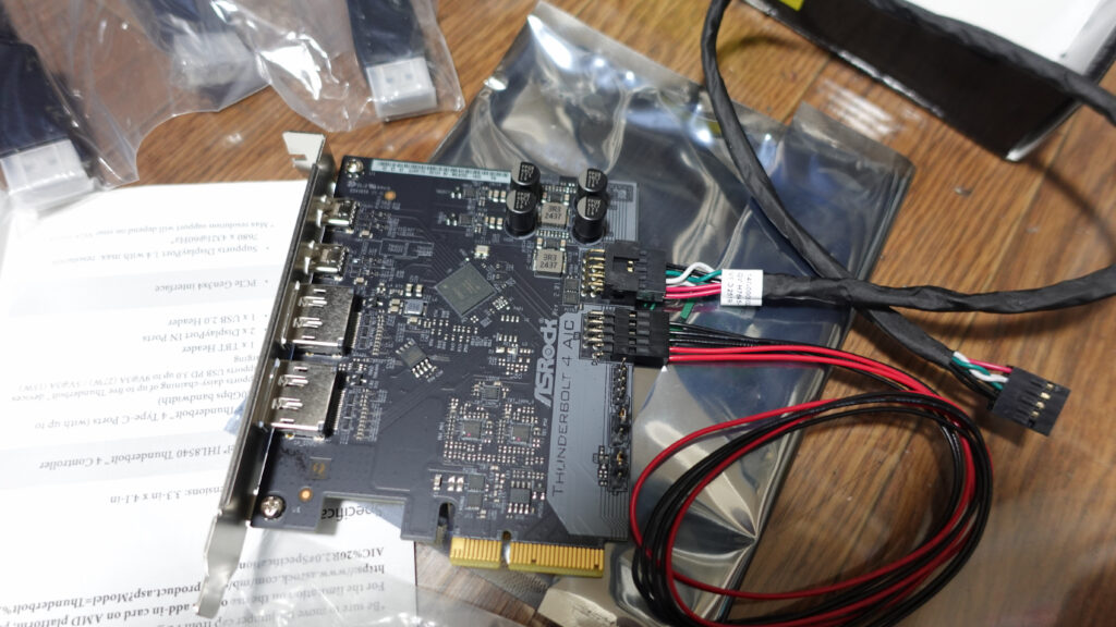自作パソコンだからこそできるオプションの付け足し。内容物はカードとメインボードとの配線2本、HDMIショートケーブル2本、インストールディスクです。