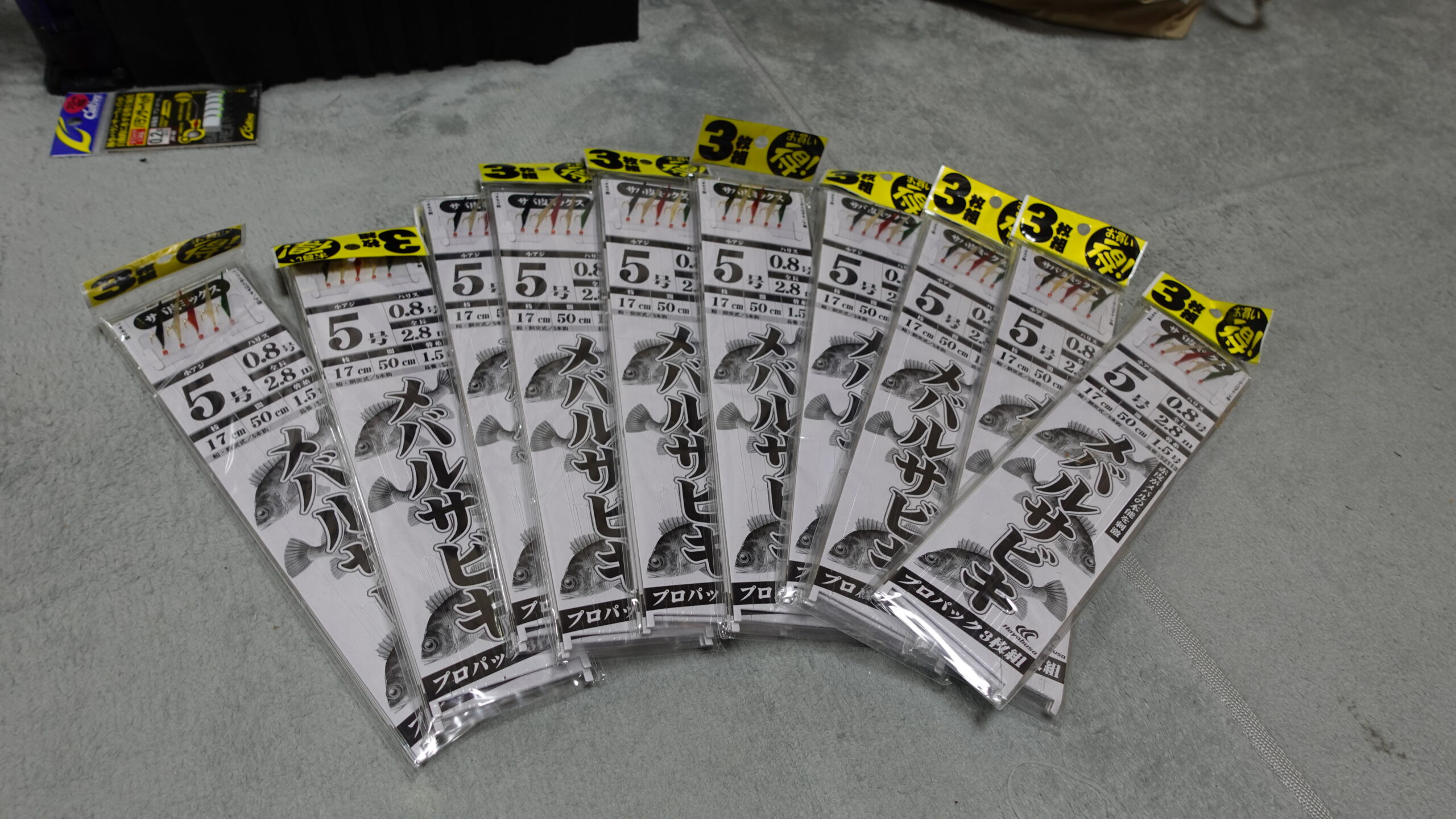 メバルサビキは糸が細いのが特徴なのですが、針5号、ハリス0.8号のサビキが一番よくつれます。このシリーズ以外のサビキも売っていますが、、、、他のサビキは1パック3枚入り720円ではなくて1枚700円でめちゃ高くなってしまいます。高くなってしまうと1回に4枚つかうとサビキだけで3000円近くになってしまい、お財布にめちゃきびしくなります。なのでこの安価でよく釣れるサビキを好んで使っています。