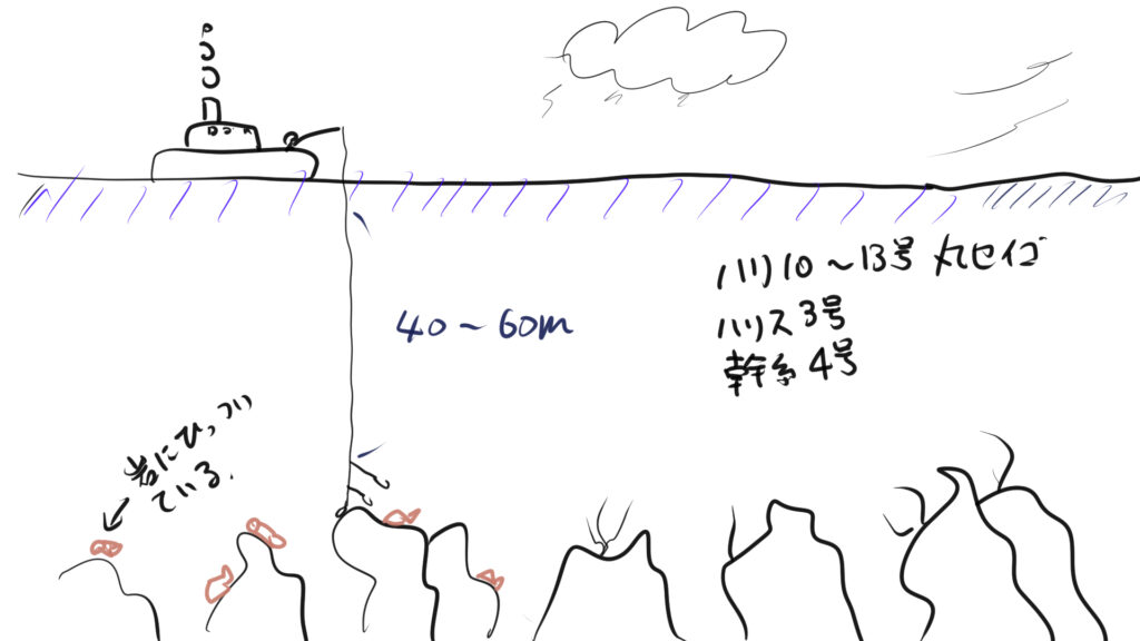 40号のおもりと2本針で船から40m~60m下の岩礁に向けて仕掛けを落とします。