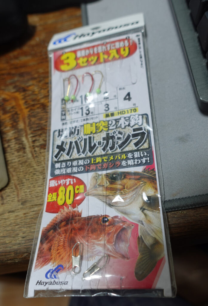 仕掛けは手作りする人もいれば、既製品(針と糸の号数が合っていれば大体使えます)を使って重りを岩礁に沿わせるような動きさせます。根魚は泳いでいるというより、岩についているイメージなので、目の前に餌が落ちてくるとパクッとくいつきます。