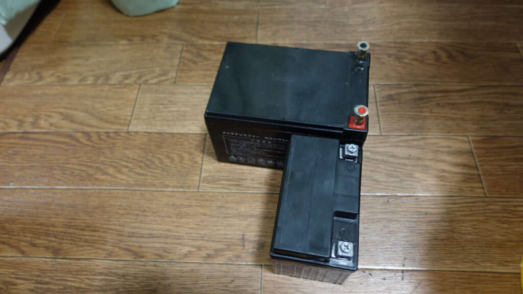 これでも3Ahのy容量に偽りがなかったらこれでいけるはず。。。。持った感じは12Ahの物と比べると1/3くらい。。。いい感じです。大きさは。。。。